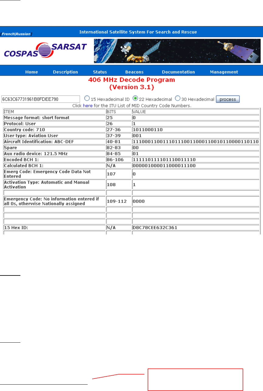 Input the 22-digit hex code into the 406 MHz Decode Program provided. See below: